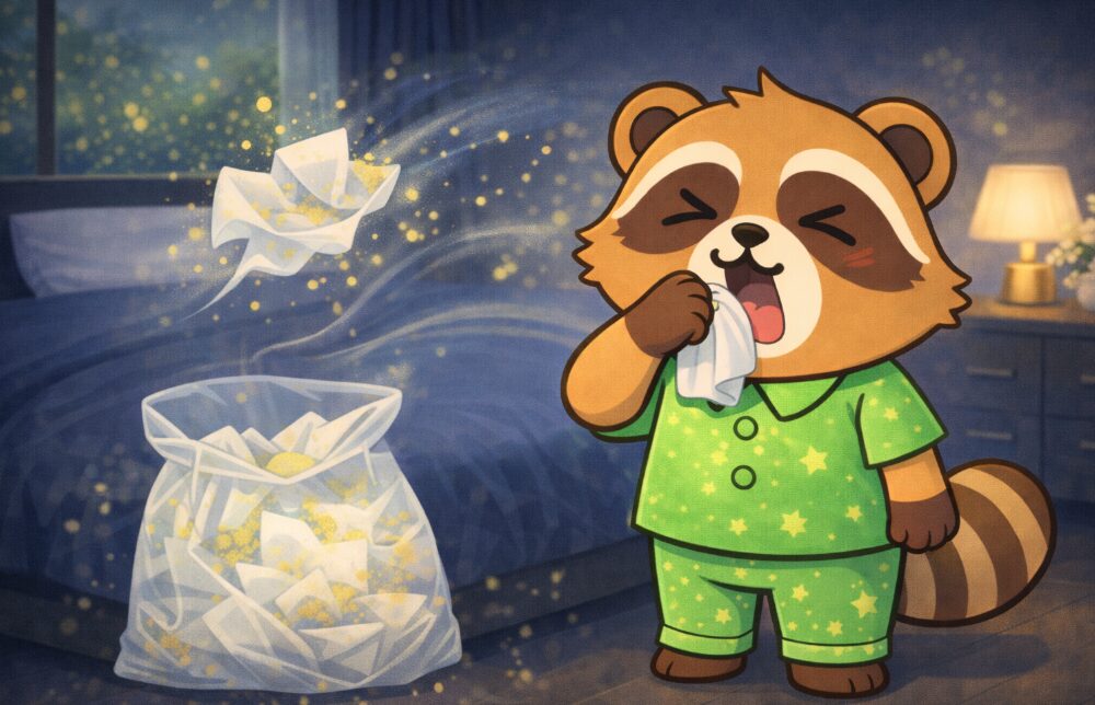 私の安眠を妨げる花粉という「外敵」と、使用済みティッシュという「邪気」を、朝まで安全に封印しておくための「最強の厄除けアイテム」なのです。
